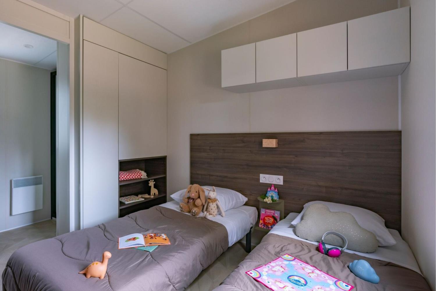 De slaapgelegenheden omvatten Slaapkamer 1 met een tweepersoonsbed (160×200 cm) en een kluis, en Slaapkamer 2 met twee eenpersoonsbedden (80×190 cm). De hoofdbadkamer beschikt over een douche, wastafel, haardroger en verwarming, terwijl een tweede badkamer ook een douche, wastafel en verwarming heeft. Twee aparte toiletten zorgen voor extra gemak.