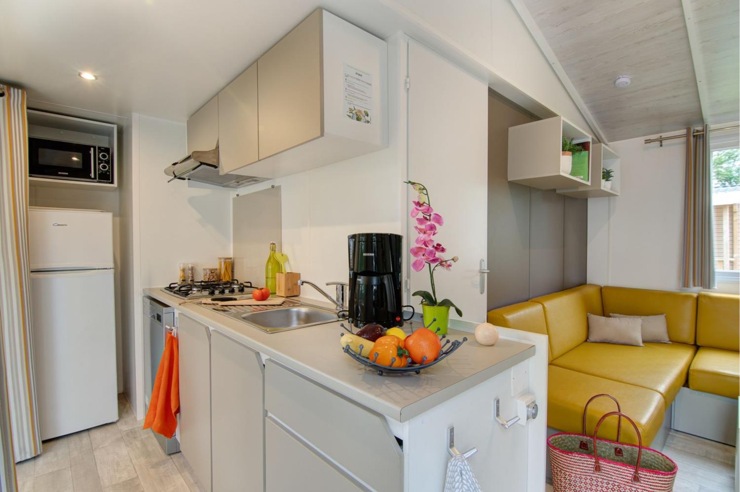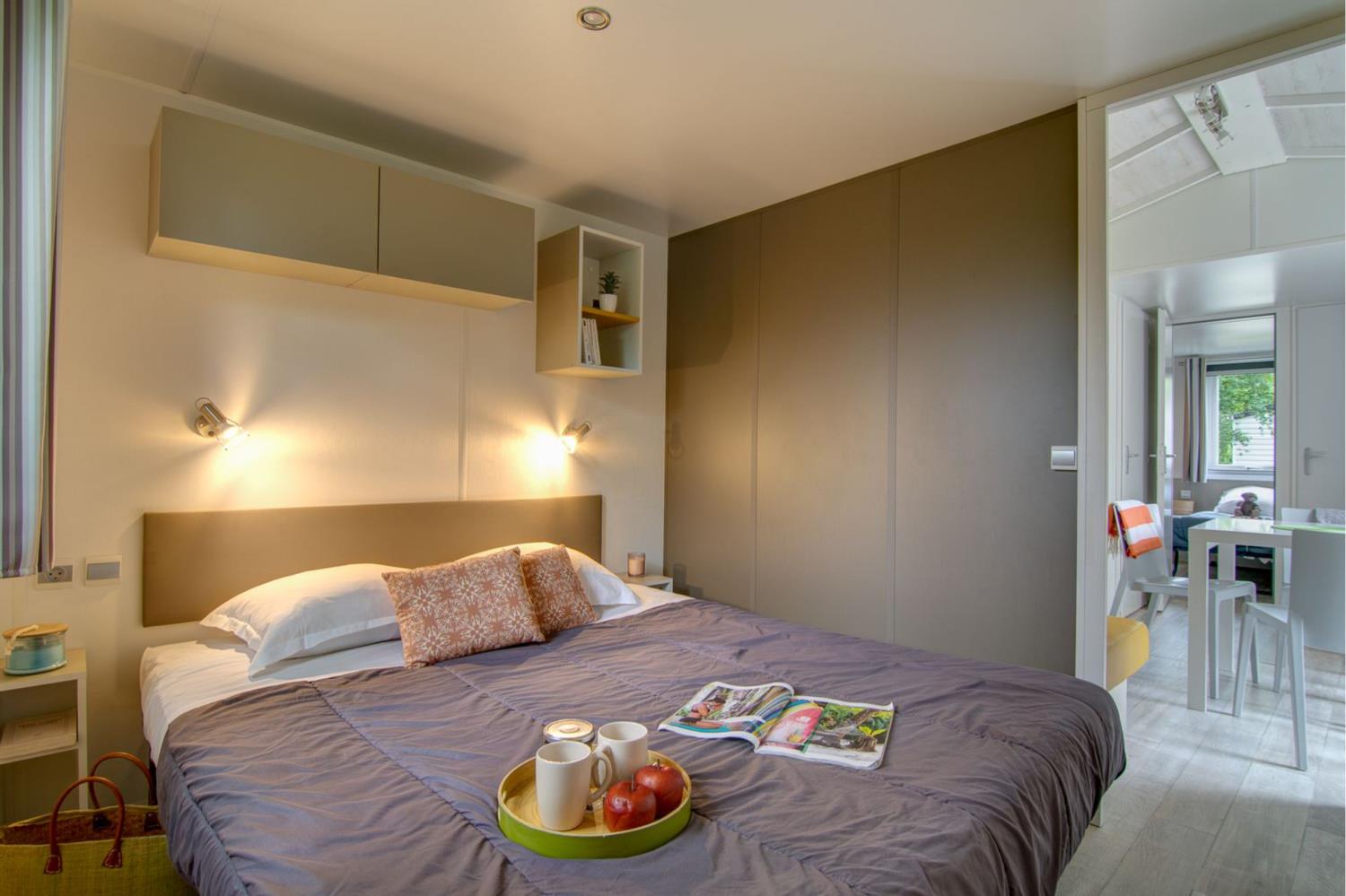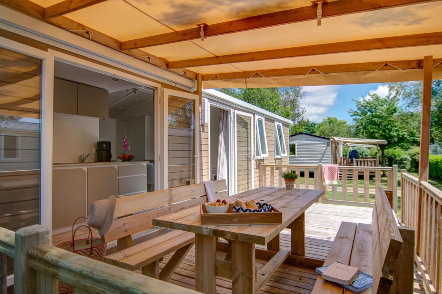Breng deze zomer uw familie en vrienden mee om de natuurlijke schoonheid van Bretagne te ontdekken tijdens een verblijf op de camping Deux Fontaines! Stap binnen in uw nieuwe stacaravan, waar ruimte en comfort samenkomen voor een ontspannen vakantie. De woonkamer is licht en uitnodigend, met bank, eettafel met stoelen, televisie en verwarming - perfect om samen te komen na een dag vol ontdekkingen.