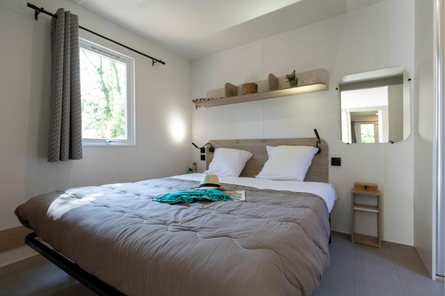 De slaapmogelijkheden omvatten een slaapkamer met tweepersoonsbed (160x200 cm) en een tweede slaapkamer met twee eenpersoonsbedden (80x190 cm), ideaal voor kinderen of vrienden. De badkamer is uitgerust met douche, wastafel en verwarming en is ook geschikt voor gasten met beperkte mobiliteit.