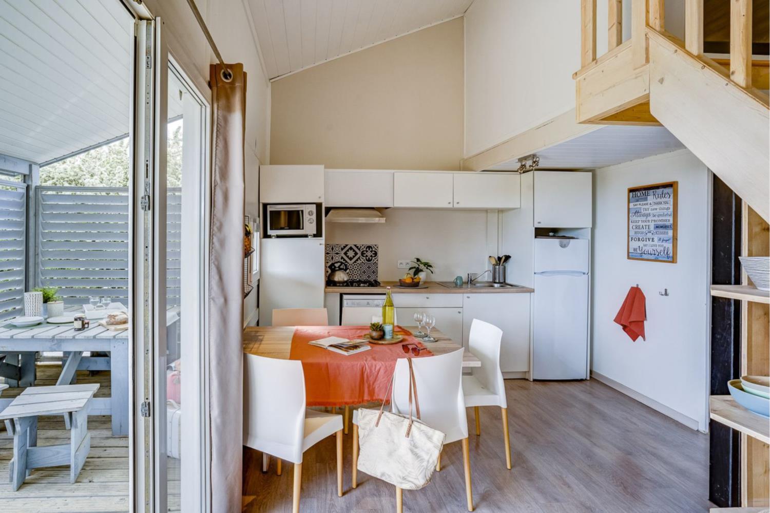 Op de bovenverdieping bieden de twee mezzanine-slaapkamers comfortabele slaapruimtes terwijl de openheid van de leefruimte beneden behouden blijft. Eén slaapkamer is ingericht met een tweepersoonsbed (160 × 200 cm) en een kledingkast. De tweede slaapkamer is ideaal voor kinderen of extra gasten en beschikt over een eenpersoonsbed (70 × 190 cm), een uitschuifbed (70 × 190 cm), een stapelbed (70 × 190 cm) en een kledingkast. Stapelbedden zijn niet geschikt voor kinderen jonger dan 6 jaar. Maximaal toegestaan gewicht: 60 kg.