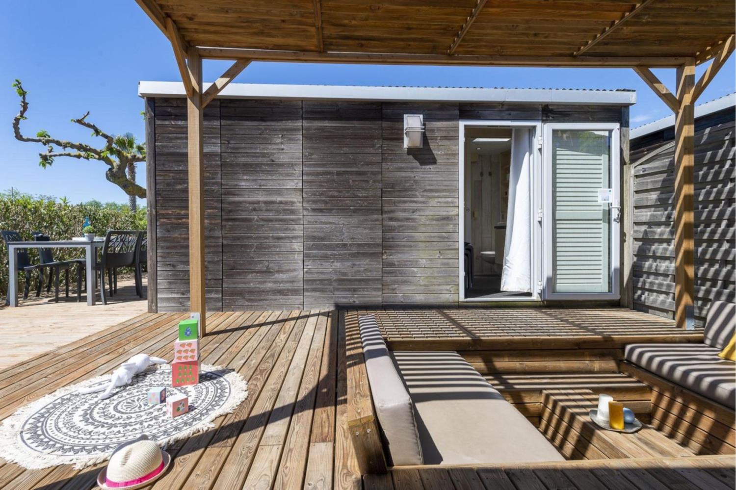 Buiten kunnen gasten genieten van een buitenruimte met een half overdekt terras, ingericht met tuinmeubilair, ligstoelen, een hangmat, een droogrek en een plancha-grill.