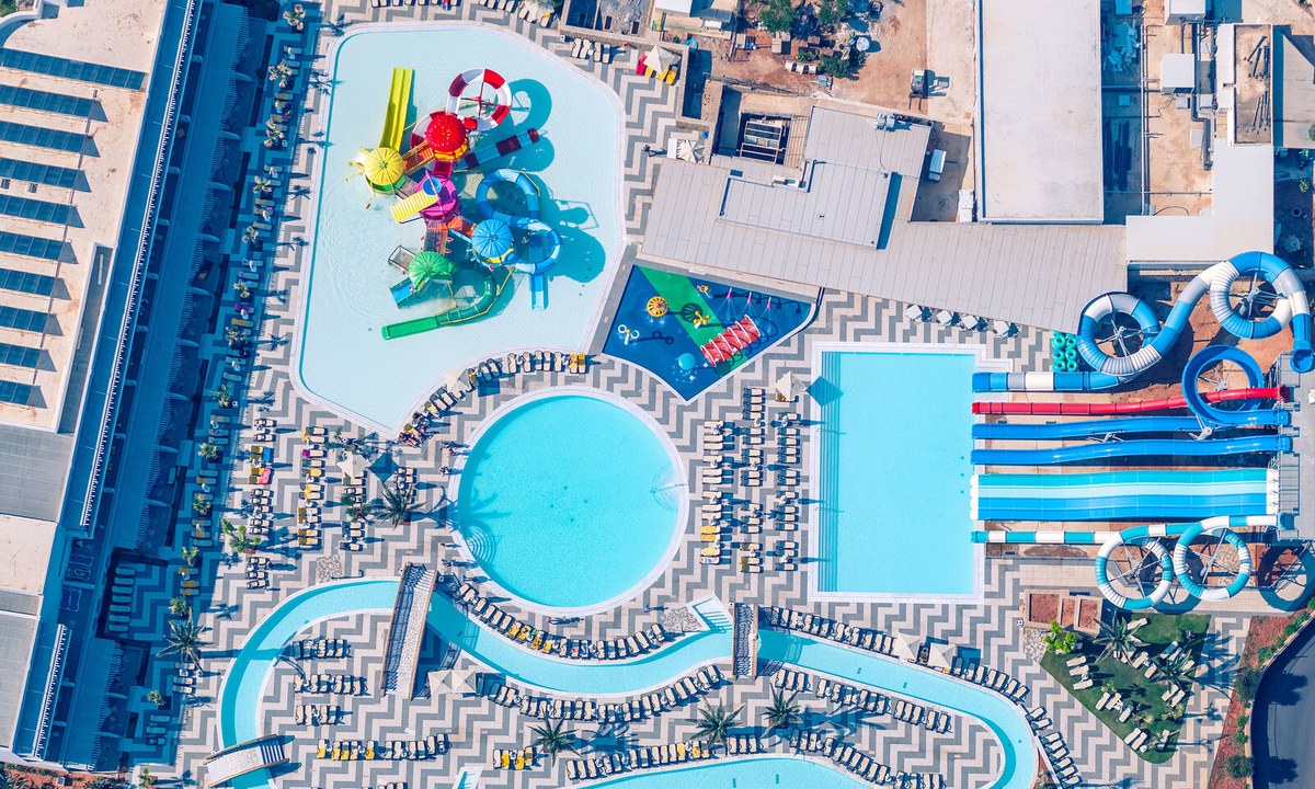 Hotel Lyttos Beach in Hersonissos.Direct aan breed zandstrand. Groot waterpark met glijbanen en watersproeiers. Speeltuin, tennis en voetbalvelden.