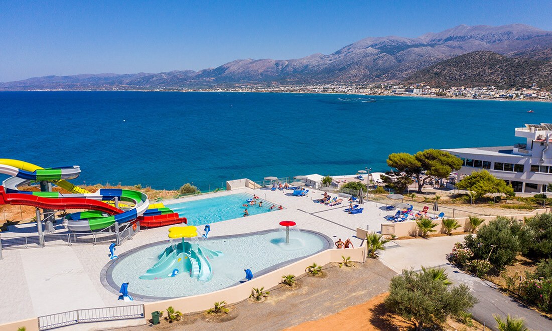 Hotel Horizon Beach in Stalis.Direct aan zee, met prachtig uitzicht. Zwembaden en glijbanen voor uren plezier. Wandel naar het strand of het centrum.