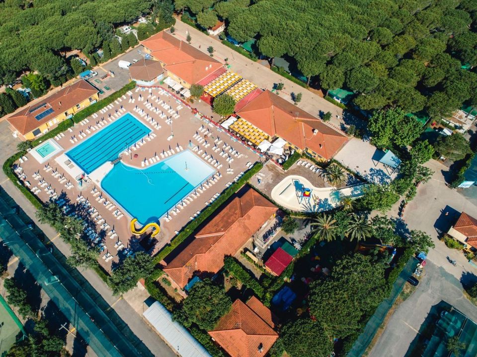 In een uitgestrekt dennenbos van 15 hectare in Cecina Mare, Toscane, ligt deze camping met een groot buitenzwembad voorzien van een waterglijbaan en een apart kinderbad. Na het zwemmen kun je ontspannen op het ruime zonneterras met ligstoelen of via een schaduwrijk pad direct naar het kenmerkende zand- en kiezelstrand van de regio wandelen.Sportliefhebbers kunnen gebruikmaken van tennis-, voetbal-, beachvolleybal- en jeu-de-boulesbanen. Er is een openlucht fitnessruimte en voor kinderen is er een levendige miniclub met activiteiten, creatieve workshops en avondshows, verzorgd door een enthousiast team. Fietsen zijn te huur om de nabijgelegen fietspaden en het natuurgebied Tomboli di Cecina te verkennen.Het park is ingericht voor een ontspannen verblijf met functionele accommodaties voorzien van een overdekt terras. Op het terrein vind je een restaurant-pizzeria, bar, supermarkt, gratis wifi in de gemeenschappelijke ruimtes, moderne sanitaire voorzieningen, een wasserette en een
