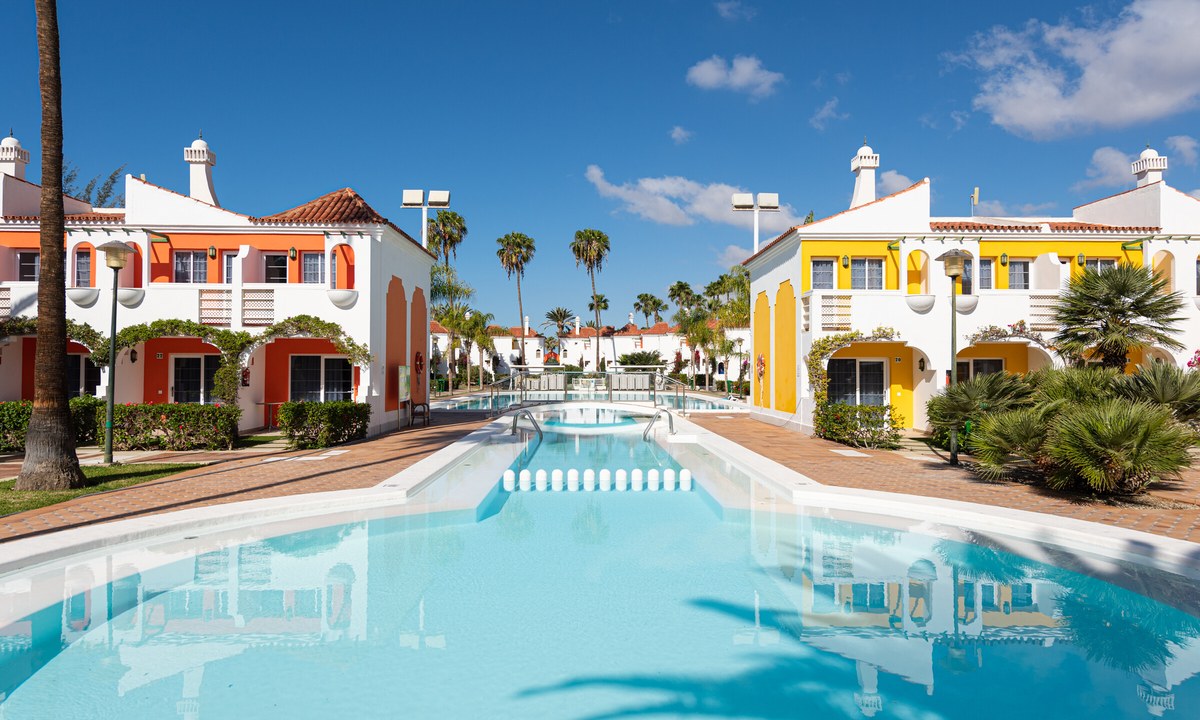 Cordial Green Golf Bungalows in Maspalomas.Gratis pendeldienst naar het strand. Grote buitenzwembaden en apart kinderbad. Kleinschalig resort met kleurrijke bungalows.